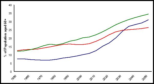 What is curious to me is that, in parallel with the literature depicting the US in decline, there is a real industry out there predicting a new hyperpower: China. It seems to me that this "China crowd" is missing a gigantic long term cloud around China's silver lining. (Hint: guess which country is represented by the blue curve?). I have a strange sort of feeling that in a decade or two the hyperpowers-to-be du jour for this crowd (a broad if unconcious coalition of Beltway Bandits and Academic Hacks Wonkish types) will be India and Brazil.
